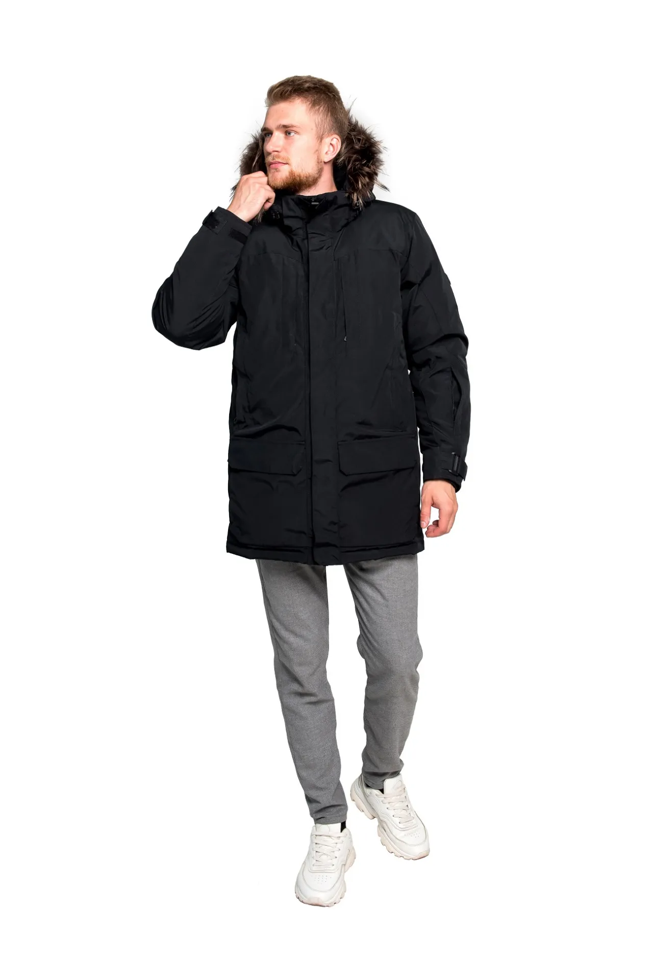 Съемный капюшон дополнен натуральным мехом енота, который не только усиливает защиту от холода и ветра, но и придает модели выразительный, статусный внешний вид. При необходимости капюшон легко снимается, позволяя менять стиль в зависимости от погоды и ситуации. Глубокие карманы удобны для хранения личных вещей и согревания рук.