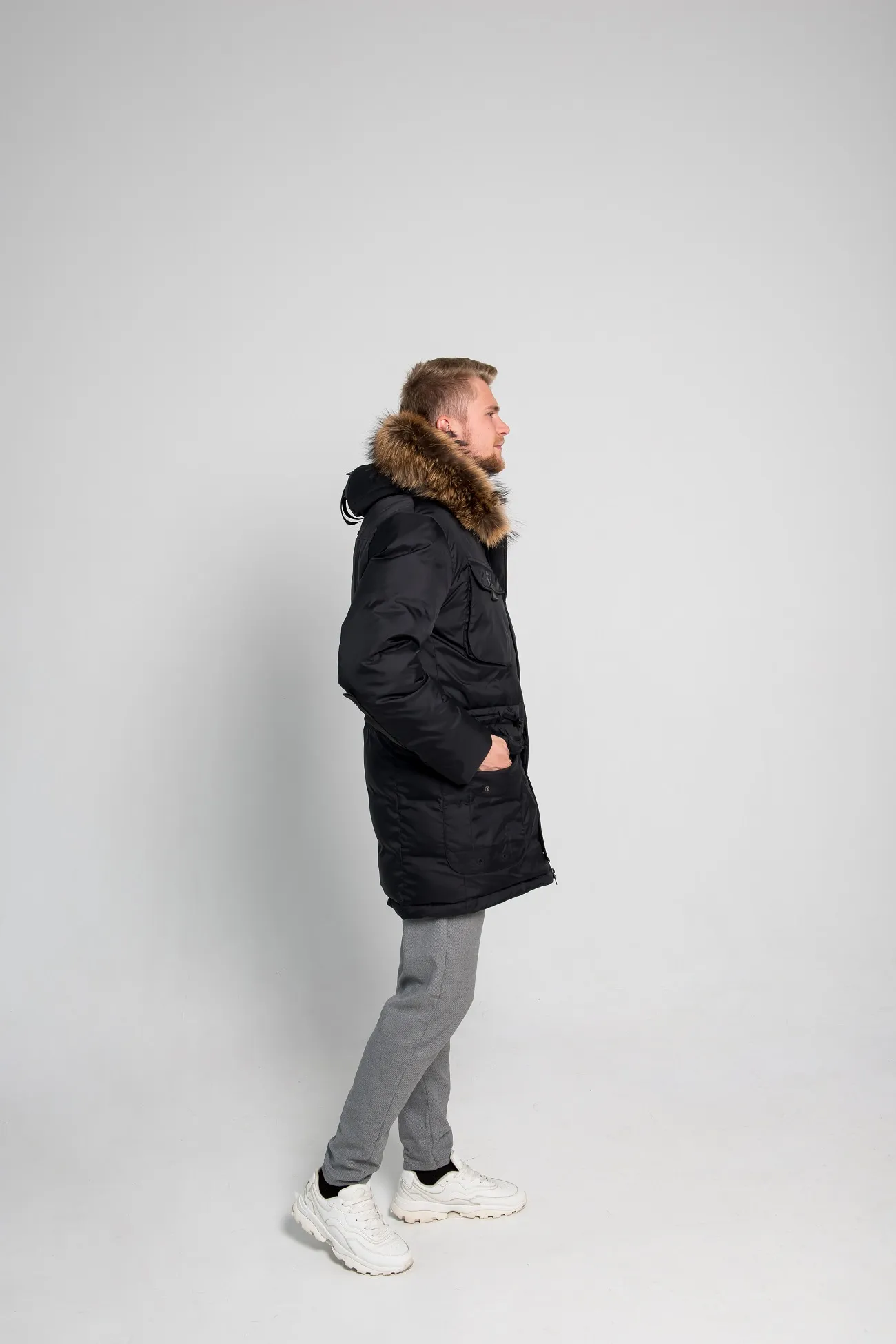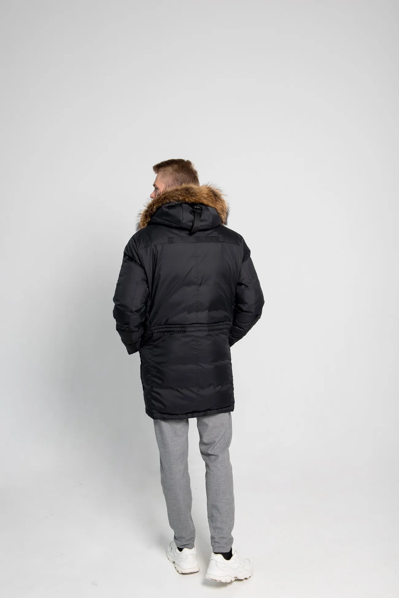 Утеплитель из 100% натурального пуха обеспечивает превосходную защиту от морозов, оставаясь лёгким и воздушным. Удлинённый крой и продуманная посадка надёжно сохраняют тепло, а глубокий капюшон с эффектным меховым кантом защищает от ветра и снега. Верхняя ткань с влагоотталкивающей пропиткой предотвращает намокание, сохраняя куртку сухой и аккуратной даже в непогоду.