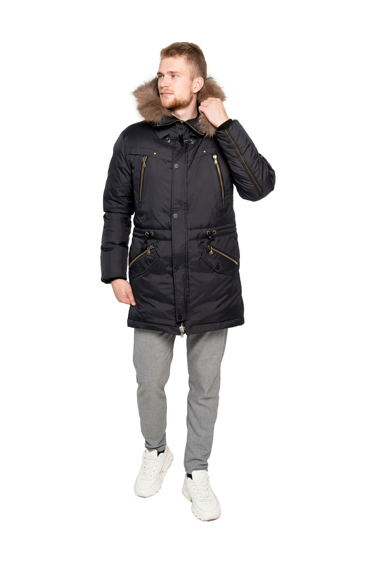 Несъемный капюшон дополнен натуральным мехом енота, который усиливает теплоизоляцию и надежно защищает от ветра и снега. Мех придает модели выразительный и статусный вид, делая пуховик актуальным и современным.