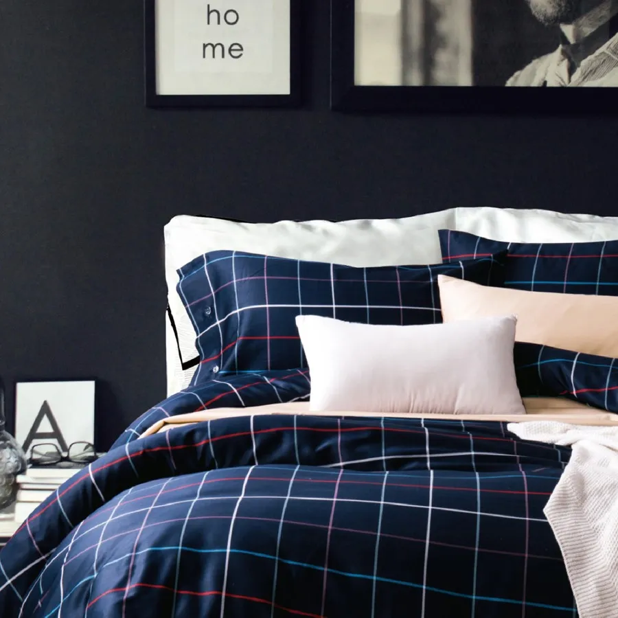 Изготовленный из 100% египетского хлопка, он радует исключительной мягкостью, шелковистым блеском и высокой прочностью, обеспечивая приятные тактильные ощущения и здоровый сон. Глубокий тёмно-синий фон с графичным рисунком в клетку создаёт динамичный и актуальный акцент, который легко впишется как в современный, так и в классический интерьер. Ткань прекрасно пропускает воздух, устойчива к выцветанию и сохраняет насыщенность цвета после многочисленных стирок.