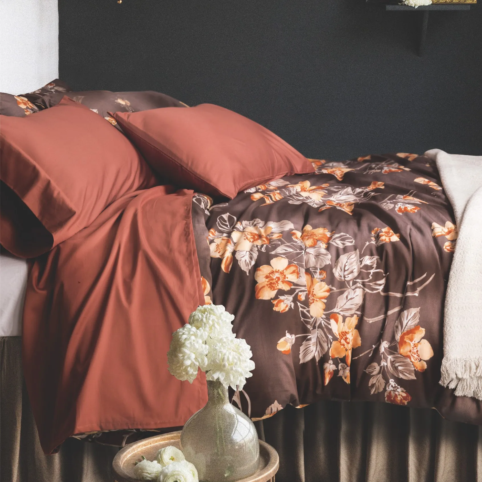 Выполненный из премиального египетского хлопка, он отличается необыкновенной мягкостью, шелковистым блеском и долговечностью. Гладкая ткань приятно охлаждает кожу и обеспечивает максимальный комфорт во время сна. Богатый шоколадный фон, украшенный нежным цветочным узором в тёплых карамельных и золотистых оттенках, создаёт атмосферу уюта и элегантной роскоши. Материал устойчив к выцветанию, легко стирается и сохраняет безупречный вид после многочисленных стирок.