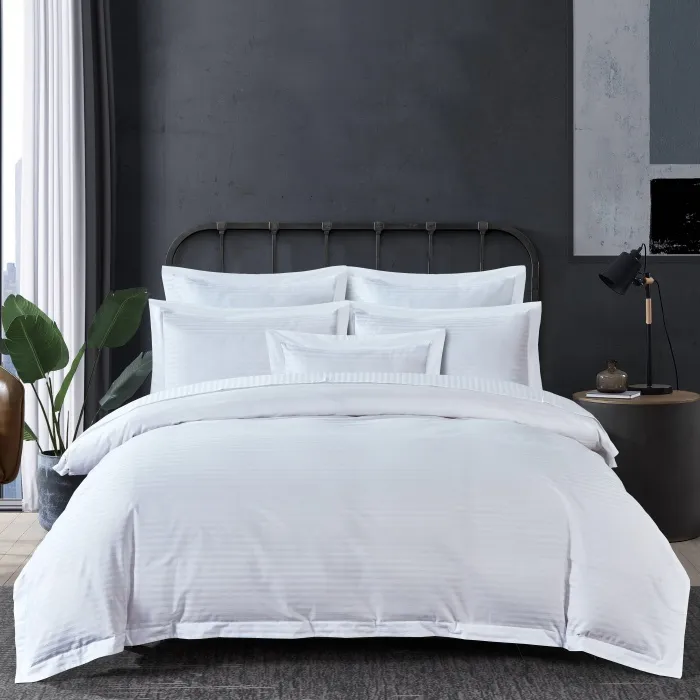 Ткань изготовлена из высококачественного хлопка сатинового переплетения, которое придаёт материалу мягкость, гладкость и характерный благородный блеск. Лаконичный жаккардовый рисунок в виде деликатных полос («страйп») создаёт изящную фактуру и подчёркивает стильный минимализм комплекта, делая его уместным как в классическом, так и в современном интерьере. Сатин-страйп отличается повышенной прочностью, хорошо пропускает воздух и прекрасно сохраняет форму и яркость даже после многочисленных стирок.