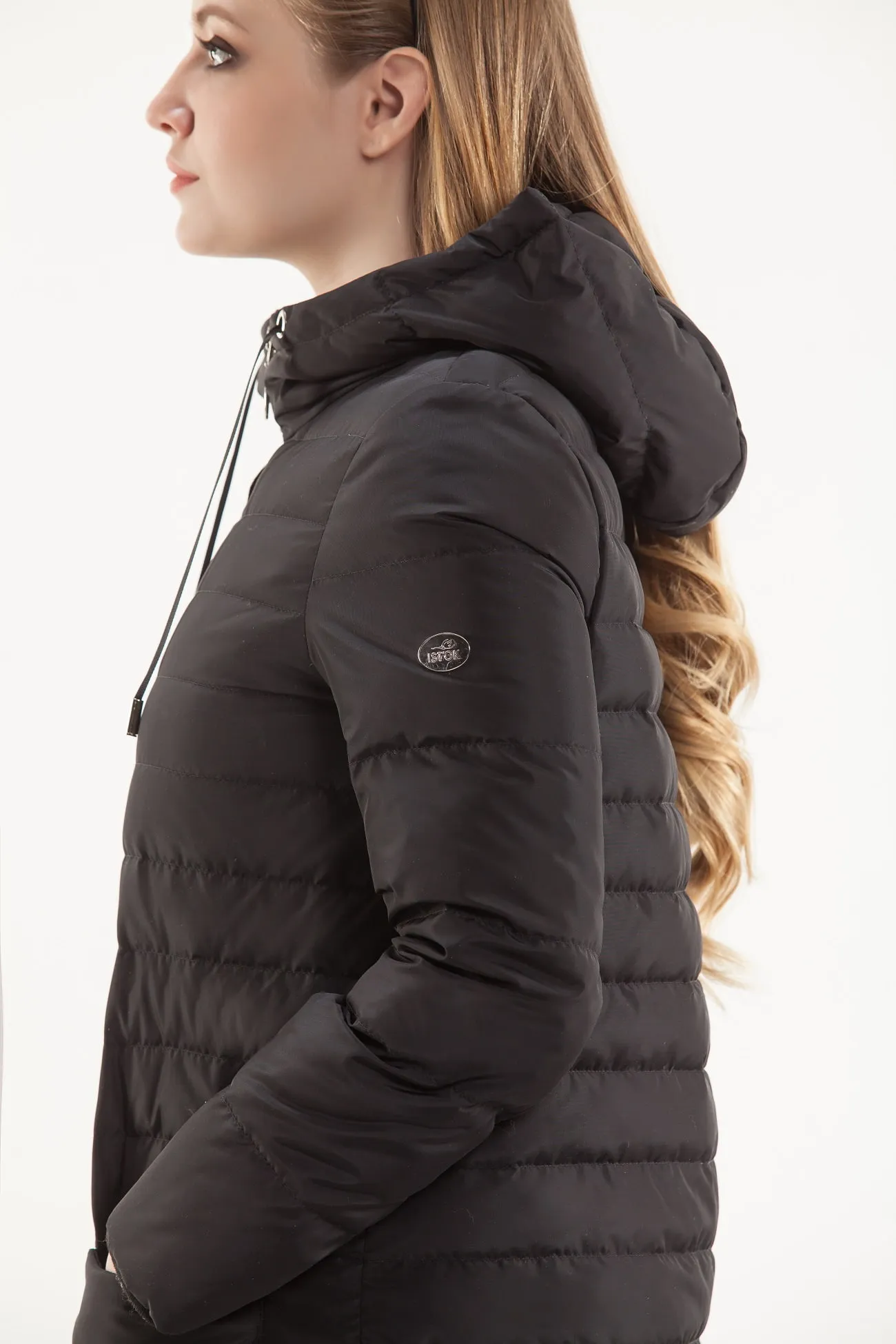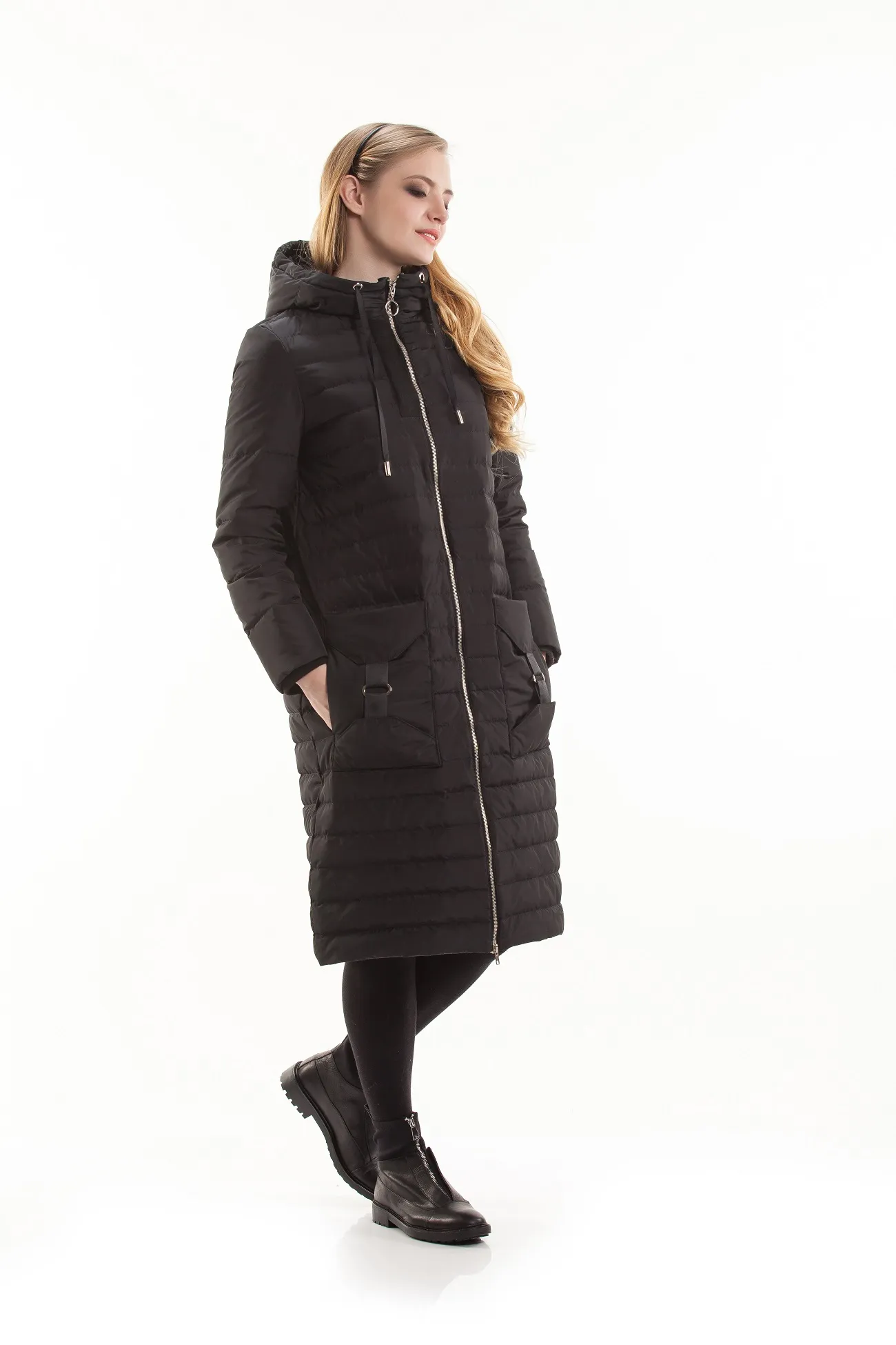 Горизонтальная стёжка придаёт изделию аккуратный объём, подчёркивая женственный силуэт. Функциональные карманы с молниями надёжно сохранят руки в тепле и защитят необходимые мелочи.