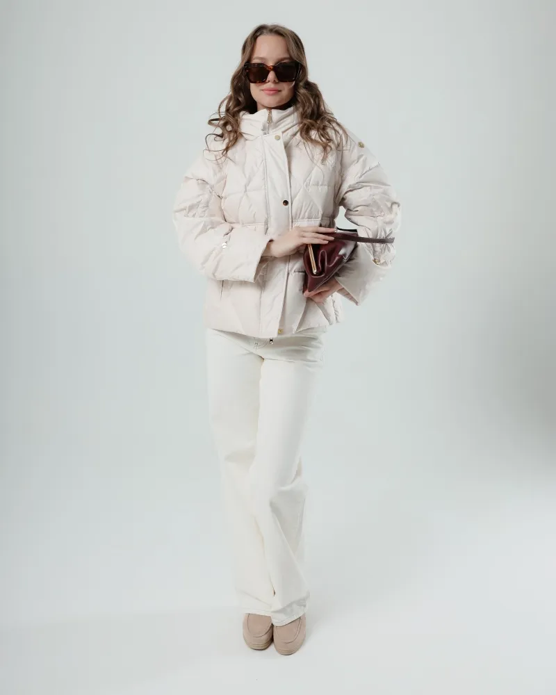 Особенность модели – эффектная стёжка в виде крупных геометрических ромбов, которая не только добавляет динамики силуэту, но и поддерживает равномерное распределение наполнителя. Удобный высокий воротник и регулируемый капюшон создают дополнительную защиту от ветра, а застёжка на молнию и кнопки делает посадку плотной и надёжной. Продуманные карманы на молниях сохранят руки в тепле и уберегут мелочи от потери.