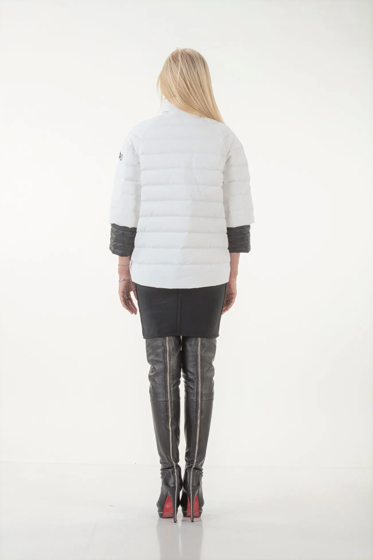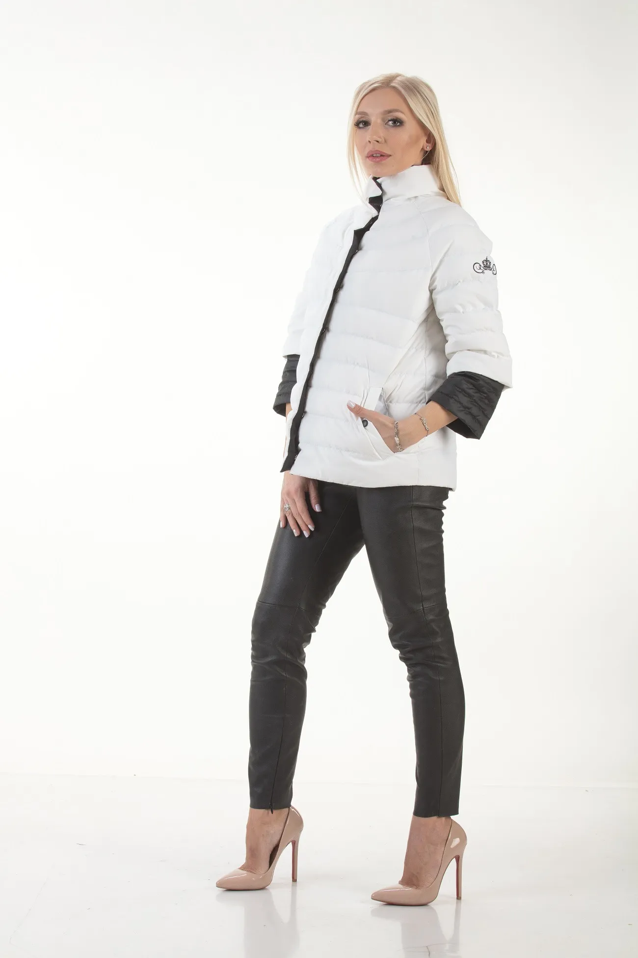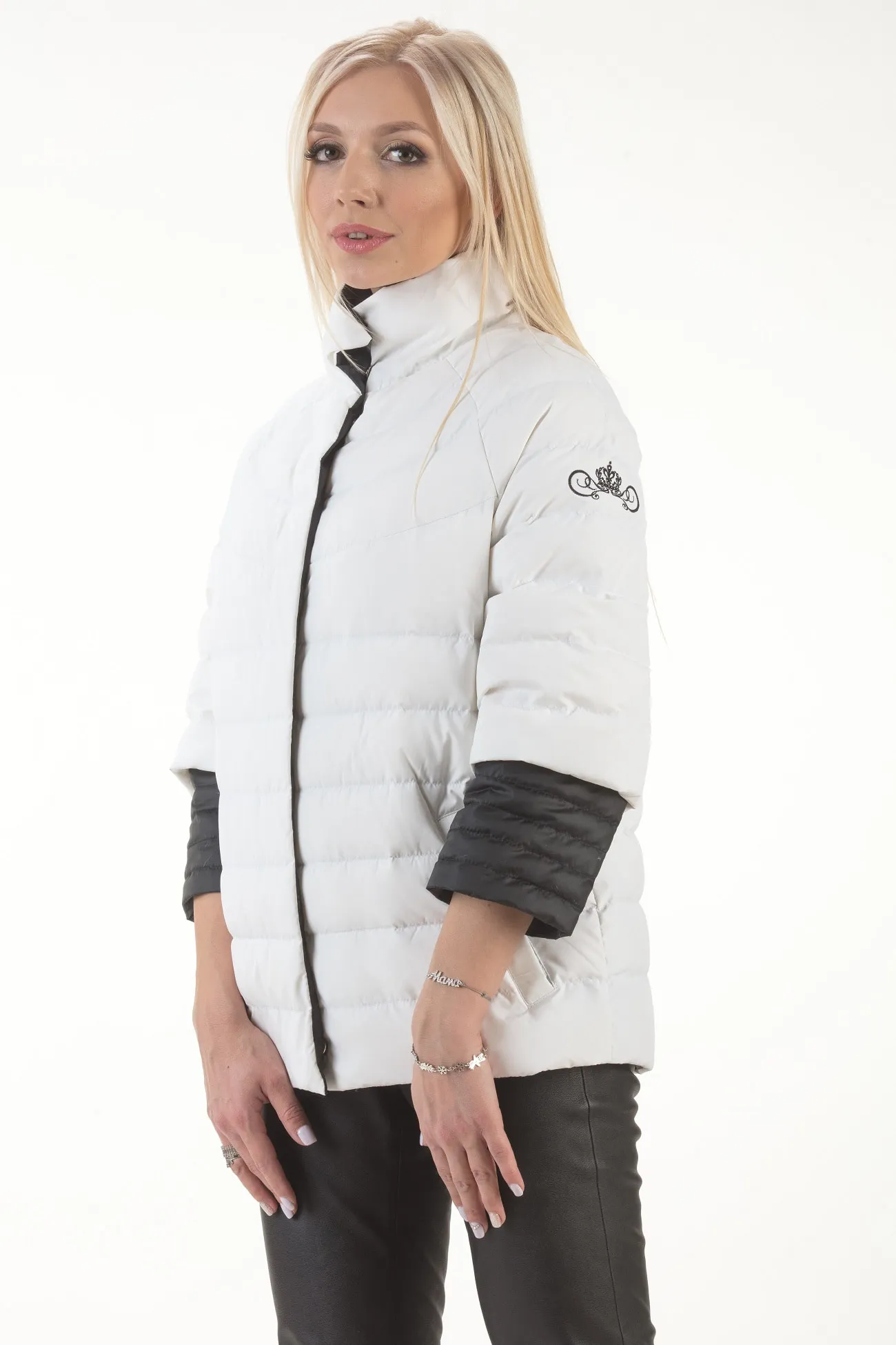 Верх выполнен из прочного современного материала с водо- и ветроотталкивающей пропиткой, что делает куртку практичной в условиях переменчивой погоды. Лаконичный прямой силуэт с горизонтальной стёжкой формирует аккуратный объём и подчёркивает изящество фигуры, а высокий воротник защищает от прохладного ветра. Удобные боковые карманы добавляют практичности, сохраняя руки в тепле и обеспечивая место для необходимых мелочей.