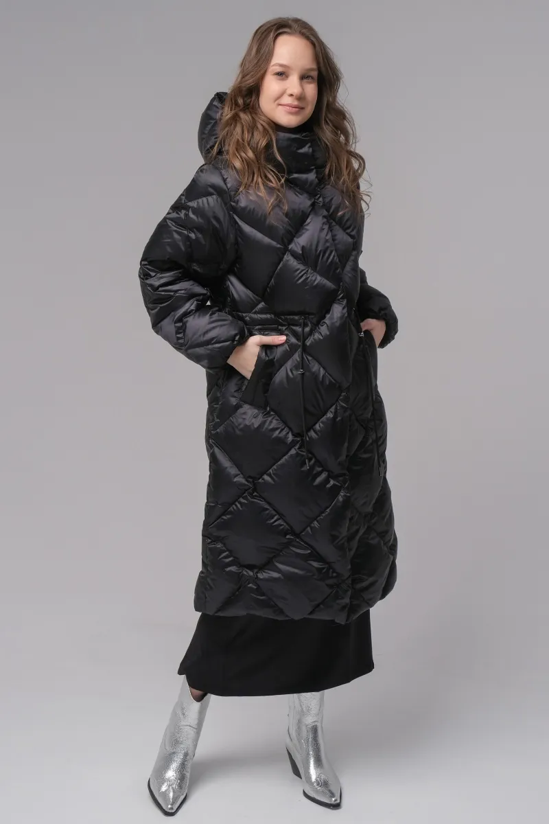Модель выполнена из натурального 100% сибирского пуха в сочетании с качественной, непромокаемой тканью, которая отлично защищает от мороза и ветра в холодную зиму. Поэтому вам несомненно будет тепло и комфортно в любую погоду. Кулиска на талии регулируется, можно ее расслабить или затянуть потуже – как вам удобно. Стежка ромбами добавляет особую изюминку в образ, делая акцент на элегантности.