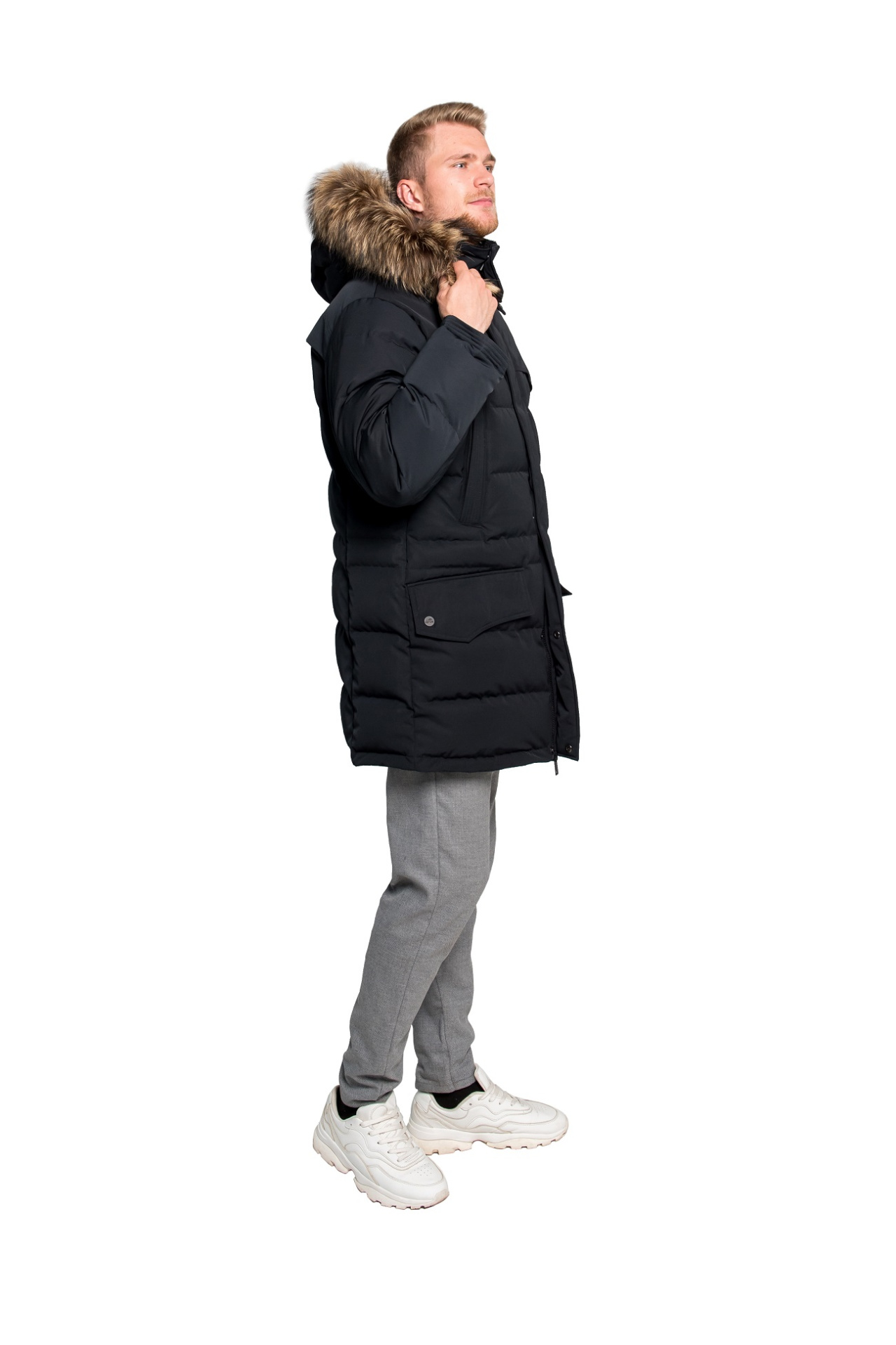 Съемный капюшон дополнен натуральным мехом енота, который усиливает защиту от ветра и холода и придает модели выразительный, статусный вид. При необходимости капюшон легко снимается, что делает образ более лаконичным. Вместительные карманы удобны для хранения личных вещей и согревания рук.