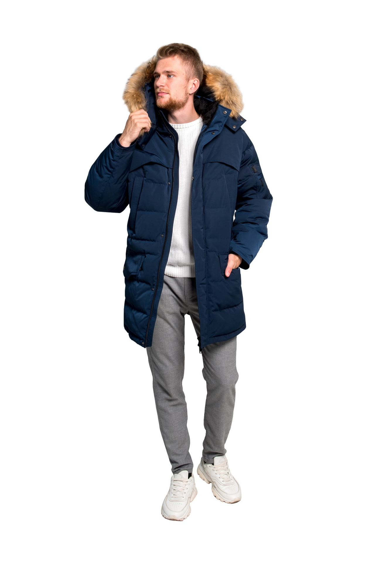 Съемный капюшон дополнен натуральным мехом енота, который усиливает защиту от ветра и холода и придает модели выразительный, статусный вид. При необходимости капюшон легко снимается, что делает образ более лаконичным. Вместительные карманы удобны для хранения личных вещей и согревания рук.