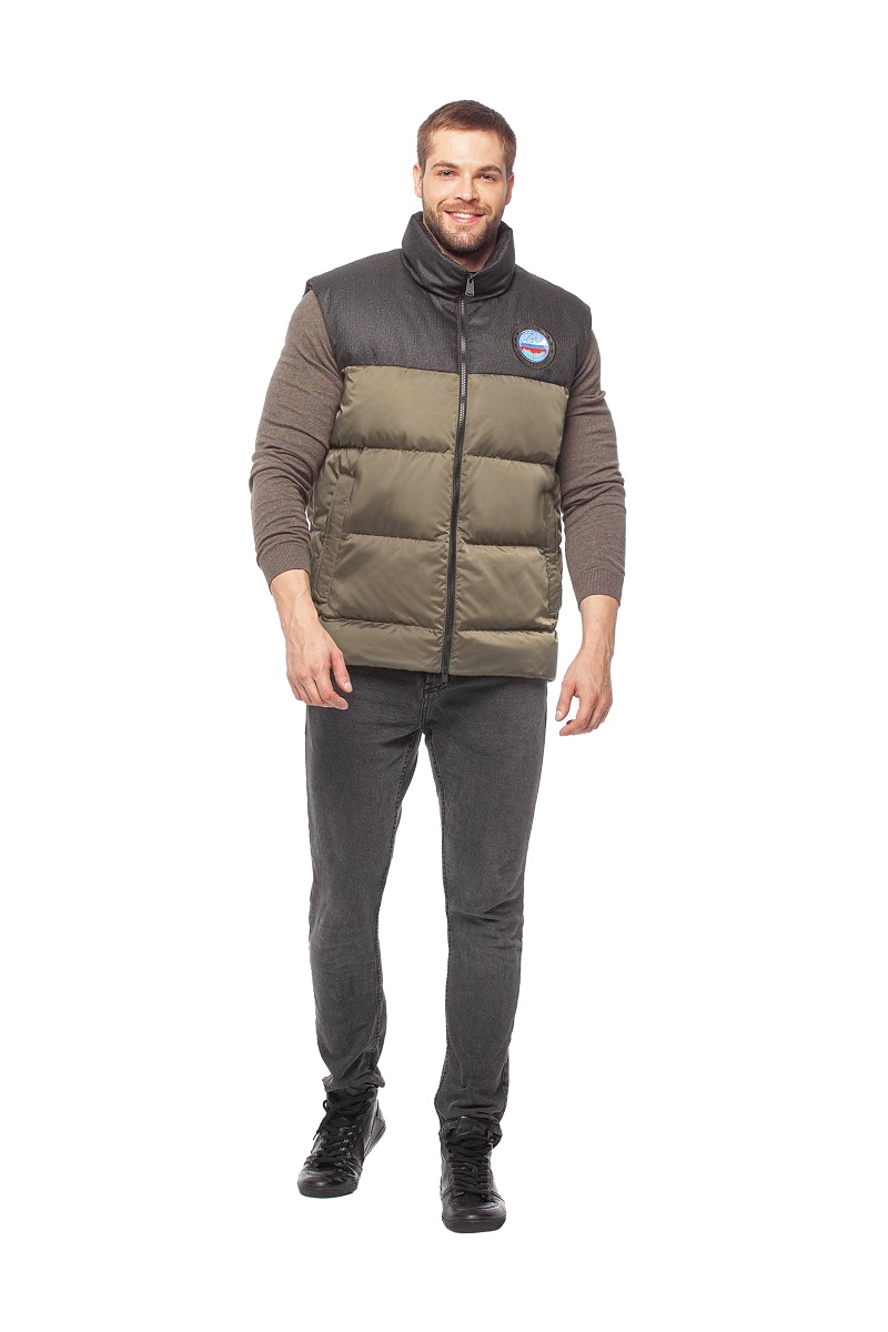 Продуманный крой гарантирует удобную посадку и аккуратный силуэт. Жилет хорошо сидит по фигуре, подчеркивая мужской характер образа и сохраняя ощущение легкости. Сочетание цветов хаки и черного выглядит стильно и эффектно, придавая модели выразительность и современное звучание. Такая цветовая комбинация универсальна и уместна как в городском, так и в более активном образе.